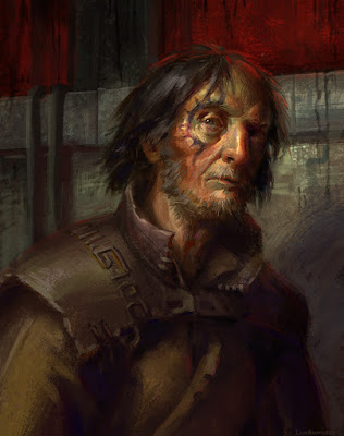 A broad flight of stairs to the left leads up to a balcony, where two muscular guards in chainmail and iron helm are watching over the proceedings. There is a bar to the rear that looks recently installed, from where a somewhat ferrety-faced barman is serving drinks. He seems to be in charge of the floor, giving orders to the Festhall girls serving drinks and food on broad wooden platters. An open doorway to right of the bar leads into a rear kitchen, and there are more doors off to the sides, except the right-hand wall, which has high windows, shuttered, flanking a broad fireplace where roaring log fire burns.